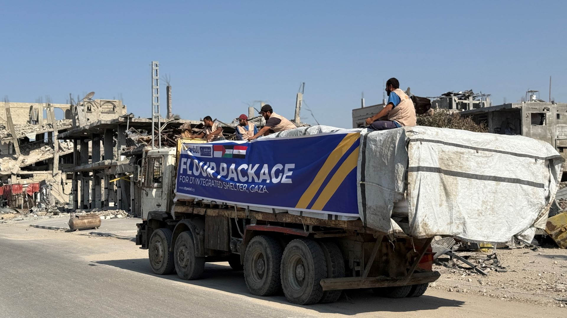 “Hari ini, kami menerima truk pertama yang memuat tepung setelah perang berhenti dan bantuan mulai masuk ke Jalur Gaza,” ujar Mohammad Nabahin, Relawan DT Peduli saat melepas truk dari Rafah, Mesir.