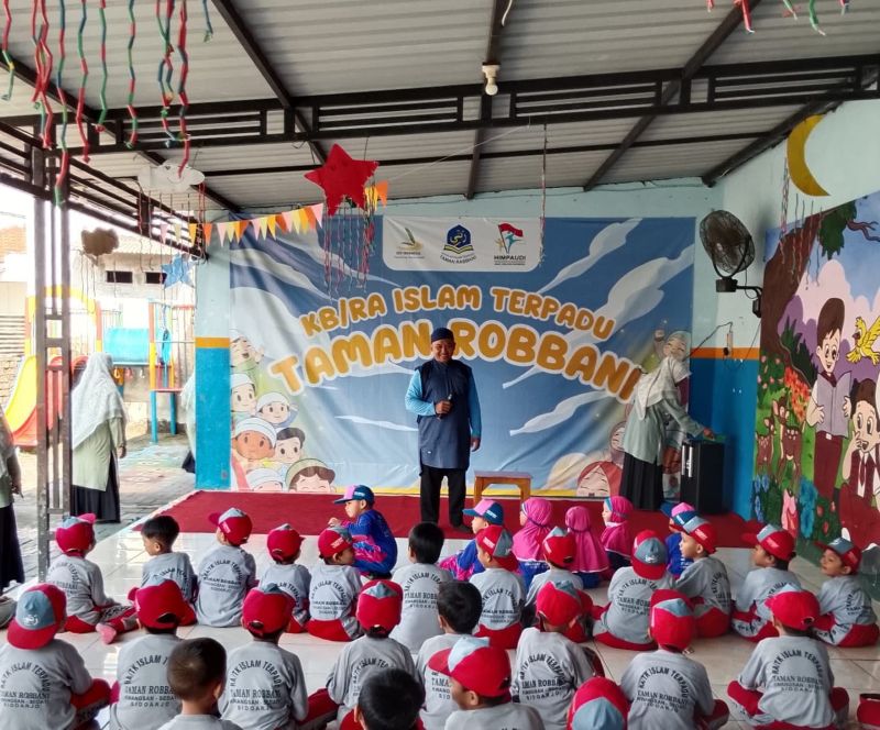 DTPEDULI.ORG | SIDOARJO – TK Robbani berkolaborasi dengan DT Peduli Jawa Timur (Jatim) menyelenggarakan peringatan Maulid Nabi Muhammad Saw. yang edukatif dan interaktif pada Jumat (12/9/2025). Acara ini bertujuan menanamkan nilai-nilai keteladanan Rasulullah Saw. kepada anak-anak usia dini melalui dongeng bersama Kak Aris dan boneka Si Mantul.