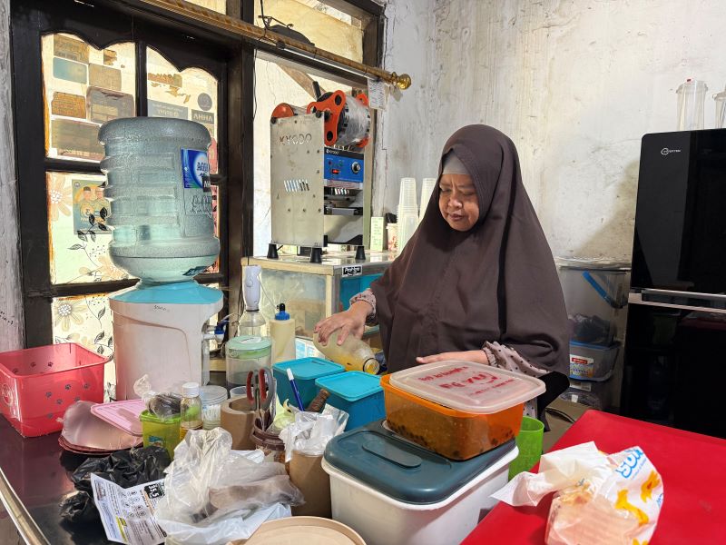 Selain berjualan secara daring, Mulyati tetap setia berjualan luring di depan rumahnya. Untuk pelanggan sekitar, ia menyediakan varian minuman yang lebih sederhana dan terjangkau.