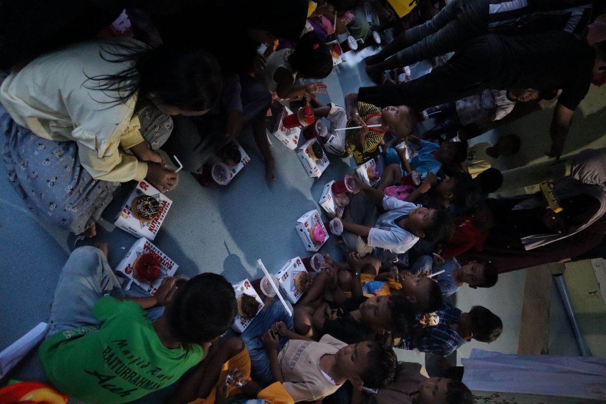 "Muhammad Alfi namanya," ucapnya membetulkan panggilan saat disapa. Meski belum kuat menjalankan ibadah puasa seharian penuh, Alfi tak mampu menyembunyikan binar matanya saat jemari kecilnya menggenggam kotak makanan.