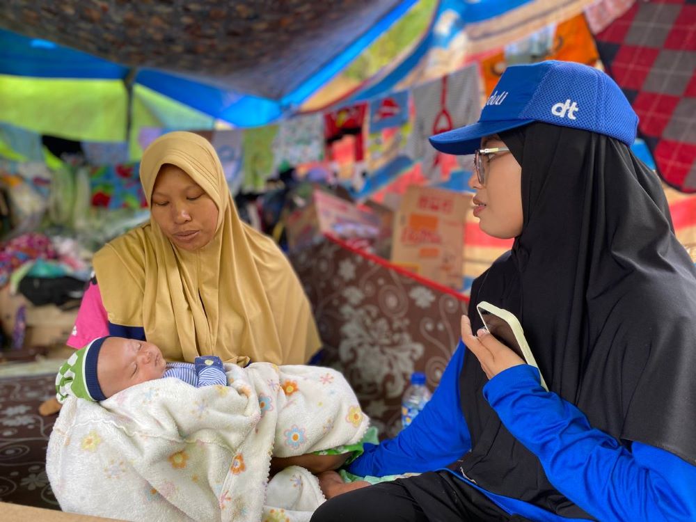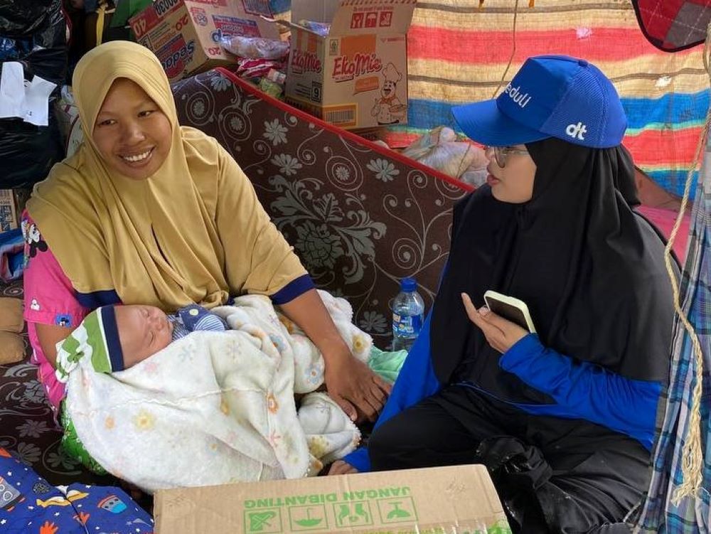 Rabu (18/12/2025), saat tim DT Peduli menyalurkan bantun membawa karung-karung beras dan minyak goreng, sebuah pemandangan menyentuh jelas terlihat di sudut pengungsian. Di dalam sebuah tenda tanpa alas dan tanpa pintu, seorang ibu muda bernama Nurasiah (25) duduk bersila.