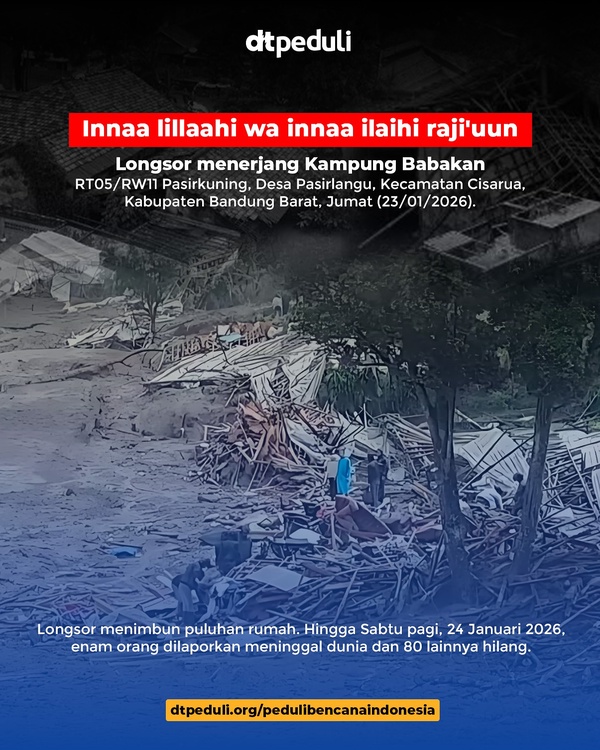 Telah terjadi bencana tanah longsor di Kampung Babakan RT05/RW11 Pasirkuning, Desa Pasirlangu, Kecamatan Cisarua, Kabupaten Bandung Barat.